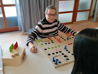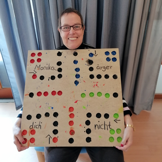 Gemeinsam mit Lara, einer angehenden Heilerziehungspflegerin, entstand ihr persönliches „Monika ärger dich nicht“. Da Monika Gesellschaftsspiele liebt, kam Lara's Idee genau zur richtigen Zeit: Ein bekanntes Spiel wurde ganz individuell angepasst.