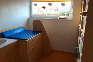Im Wickelraum hat jedes Kind ein Fach mit den eigenen Pflegeprodukten. Ein Treppe ermöglicht den Kindern eigenständig auf der Wickelauflage Platz zu nehmen.