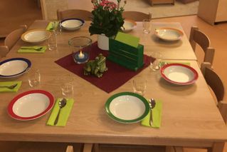 Eine schöne und leckere Unterbrechung jeden Tages ist das gemeinsame Mittagessen. Hier z.B. ein gedeckter Tisch in der Froschgruppe.