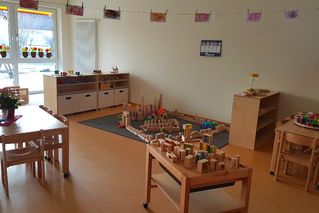 Unsere ev. Kindertageseinrichtung wurde 2013 barrierefrei gebaut und verfügt über großzügige Räumlichkeiten. Jede Gruppe hat einen Nebenraum. Des Weiteren sind eine Bewegungshalle, zwei Differenzierungsräume, ein Snoezelen-, Schlaf- und Mitarbeiter*innenraum, eine Küche, ein Mitarbeiter*innen WC; ein WC für Menschen, die auf einen Rollstuhl angewiesen sind und ein großes Foyer vorhanden.