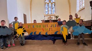 Im Familiengottesdienst präsentierte der Kita-Chor schließlich ein liebevoll gestaltetes kleines Musical. Das Singspiel setzte sich aus einer erzählten Geschichte und zahlreichen Liedern zusammen und nahm die Besucher und Besucherinnen mit auf eine musikalische Reise. Die Geschichte vermittelte, dass Jesus auch in stürmischen Zeiten an unserer Seite ist, uns begleitet und den „Sturm stillt“, wenn wir uns in schwierigen Situationen befinden.