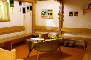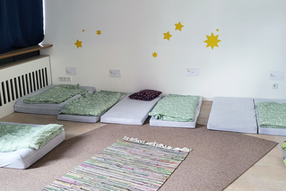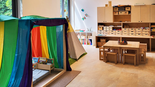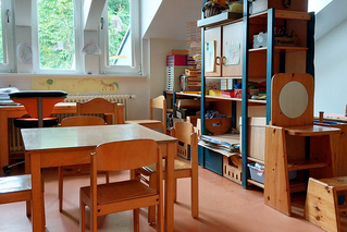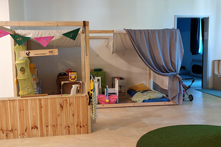 Im Nebengebäude bieten großzügig gestaltete Räume viel Platz für Bewegung, Rollenspiele und Kreativität. Auch hier gibt es kleine Räume im Raum, den wir gemeinsam mit den Kindern gestaltet haben.