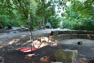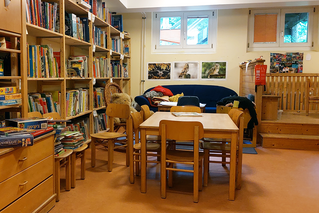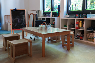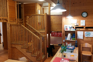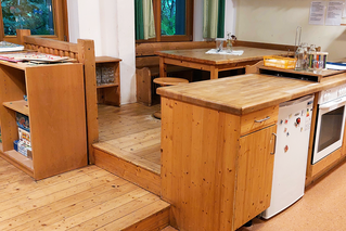 Die Gruppenräume im Hauptgebäude sind mit Holzeinbauten auf unterschiedlichen Ebenen ausgestattet. Kleine Räume im Raum bieten Platz für freies Spiel, Toben, Entspannen und Experimentieren. Über Treppen, Leitern und Stufen erreichen die Kinder diese kleinen Bereiche.