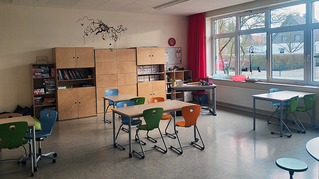 Die Anmeldung ist ein weiterer Funktionsraum in der OGS der Ostschule, in dem sich die Kinder kreativ am Maltisch betätigen können, mit ihren Freunden ein Brettspiel spielen oder ein Buch lesen.